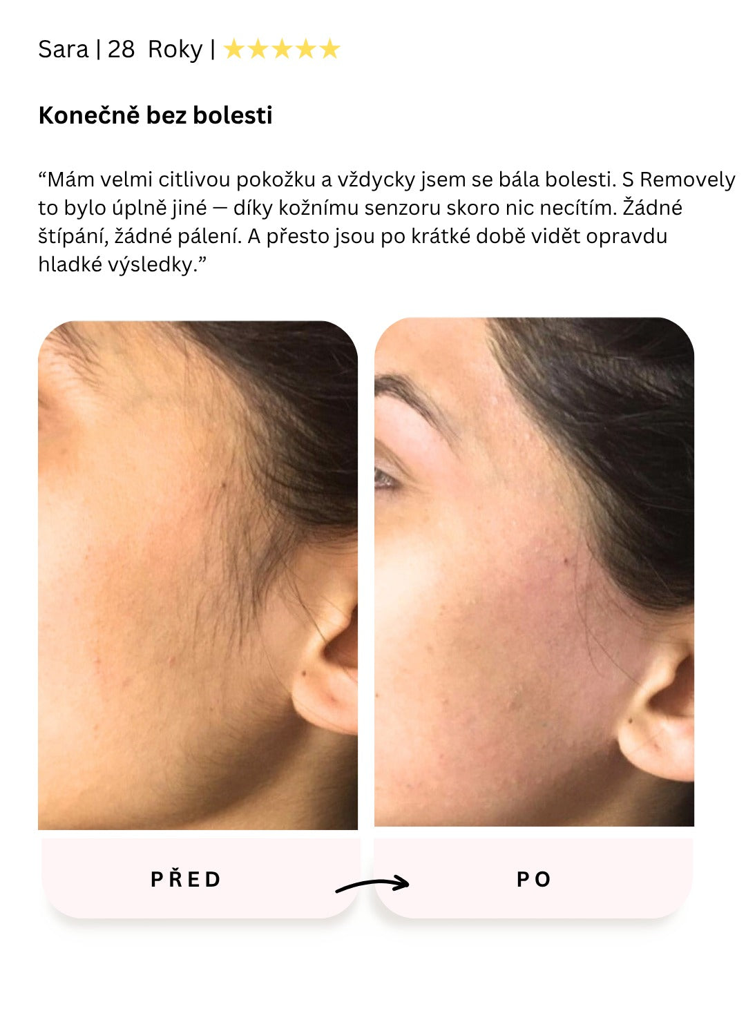 Zabieg jest całkowicie bezbolesny. Poczujesz co najwyżej lekkie ciepło na skórze – bez szarpania, pieczenia czy podrażnień skóry, jak to bywa przy innych metodach.