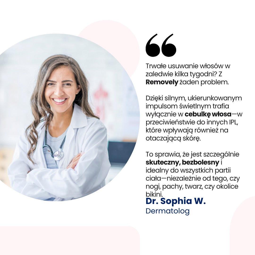 Długotrwałe, widoczne efekty bez włosków w zaledwie kilka tygodni. Skuteczne usuwanie włosków jak w salonie laserowym dzięki najnowocześniejszej technologii IPL 2025. Klinicznie certyfikowane, a ponad 50 000 kobiet w Niemczech ufa Removely.