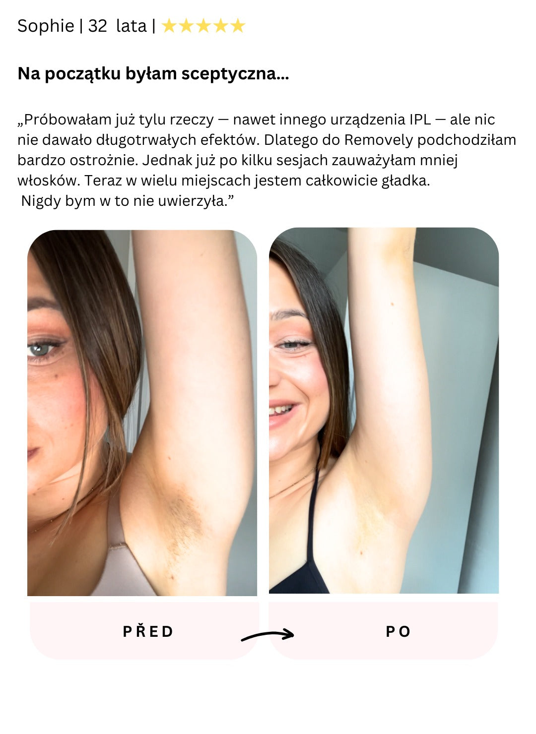 Mój chłopak kupił mi IPL od Removely na urodziny i jestem absolutnie zadowolona z urządzenia. Na początku byłam niepewna, ale wsparcie odpowiedziało na wszystkie moje pytania i już po miesiącu widzę pierwsze rezultaty.