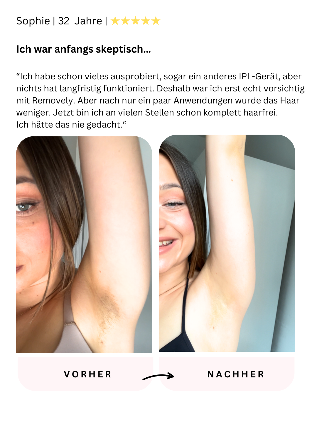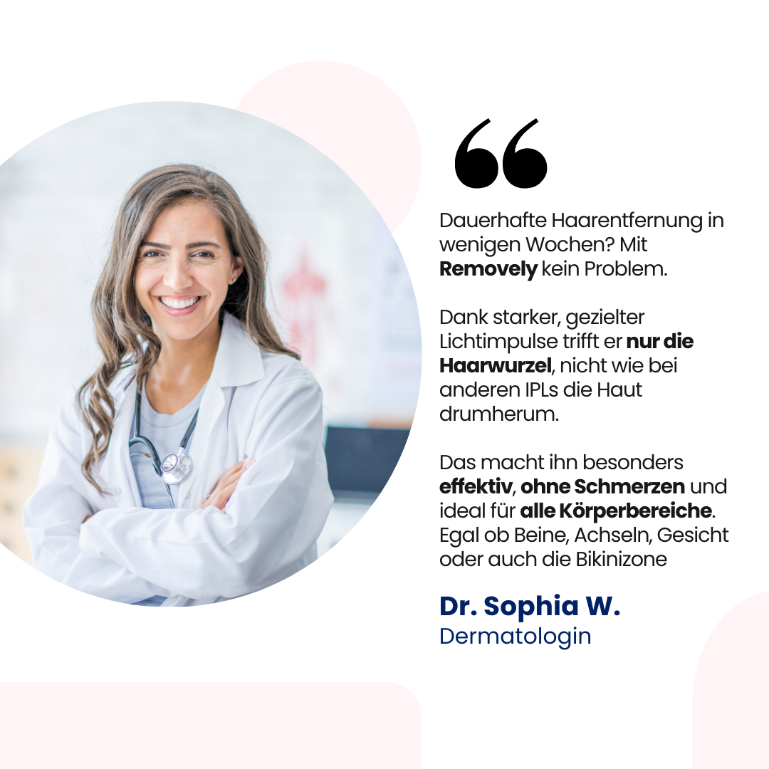 Mein Freund hatte mir den ipl von Removely zum Geburtstag geholt und bin absolut happy mit dem Gerät. War anfangs erstmal unsicher, aber der Support hat mir alle meine Fragen beantwortet und sehe jetzt schon nach einem Monat die ersten Ergebnisse