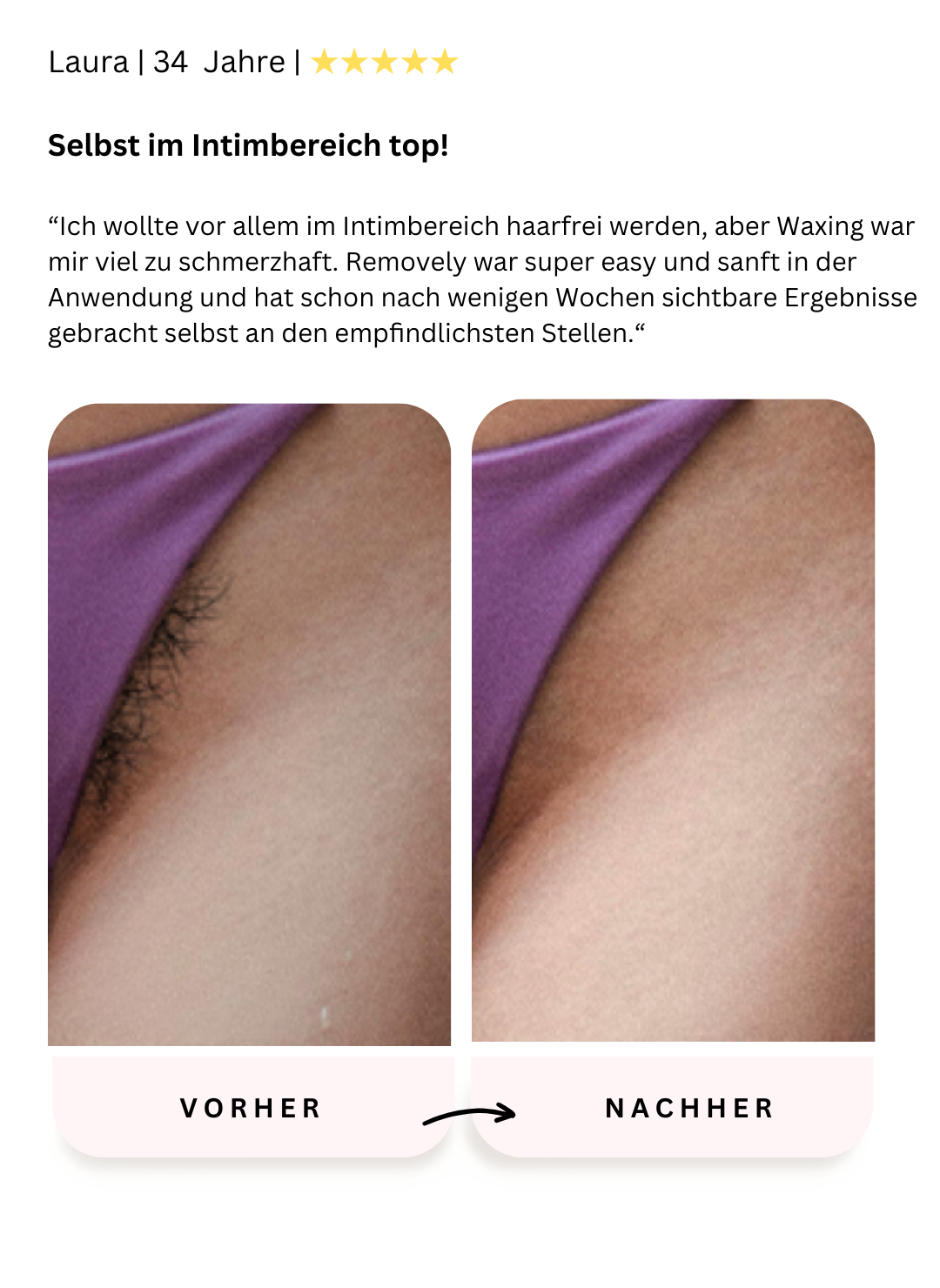 Ja, du kannst den Removely fast überall verwenden, auch im Gesicht und in empfindlichen Bereichen wie der Bikinizone. Vermeide jedoch die Anwendung auf den Genitalien, den Augen, Tattoos oder offenen Wunden.